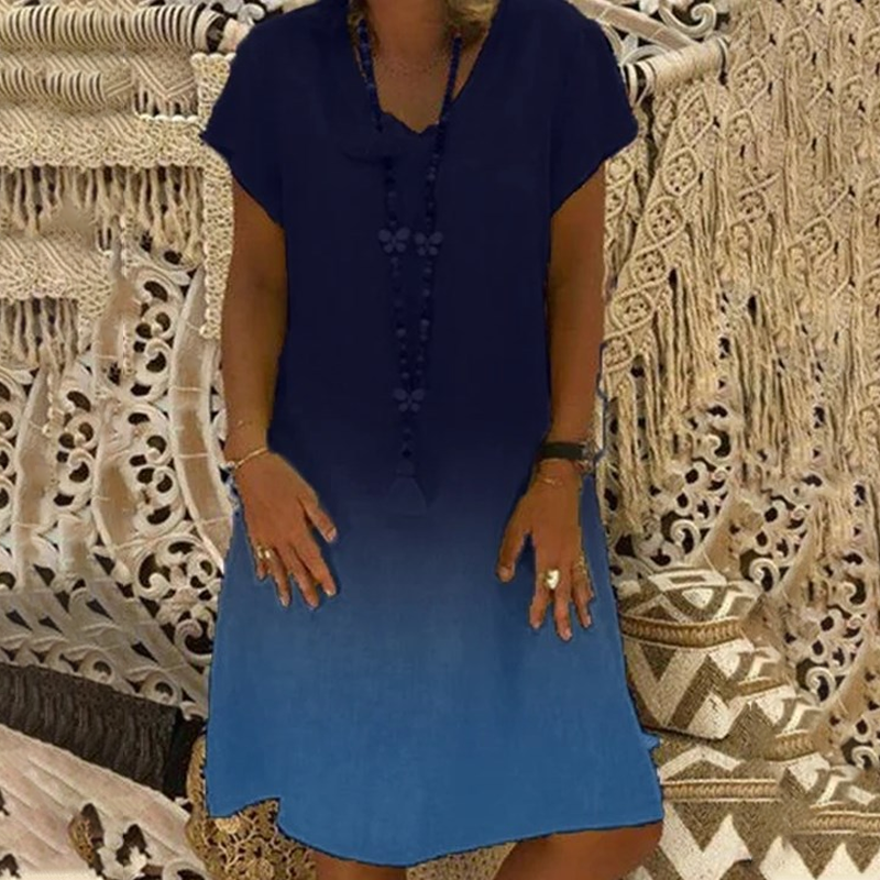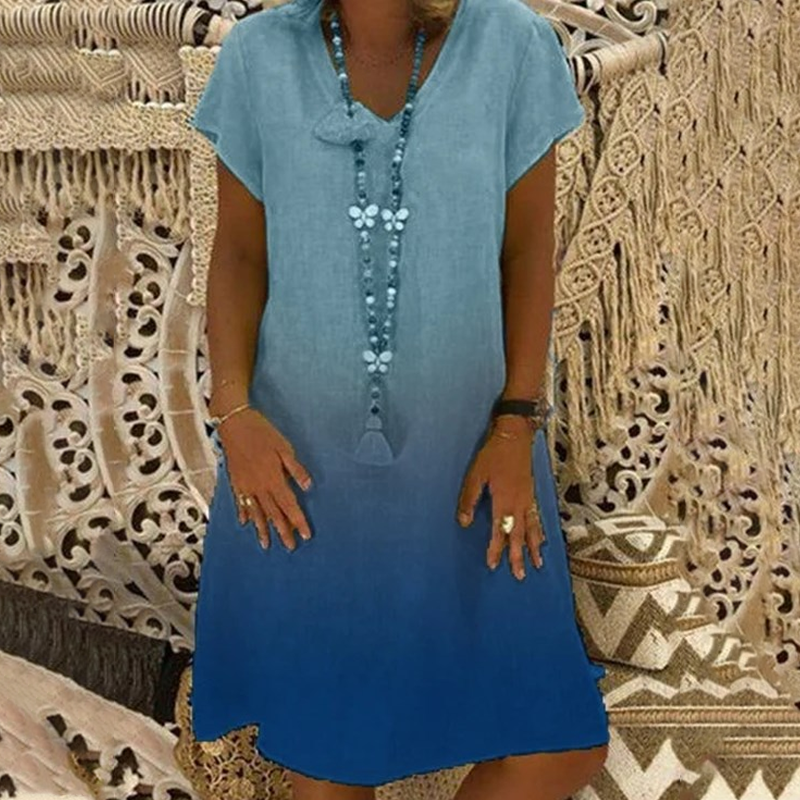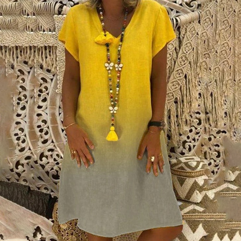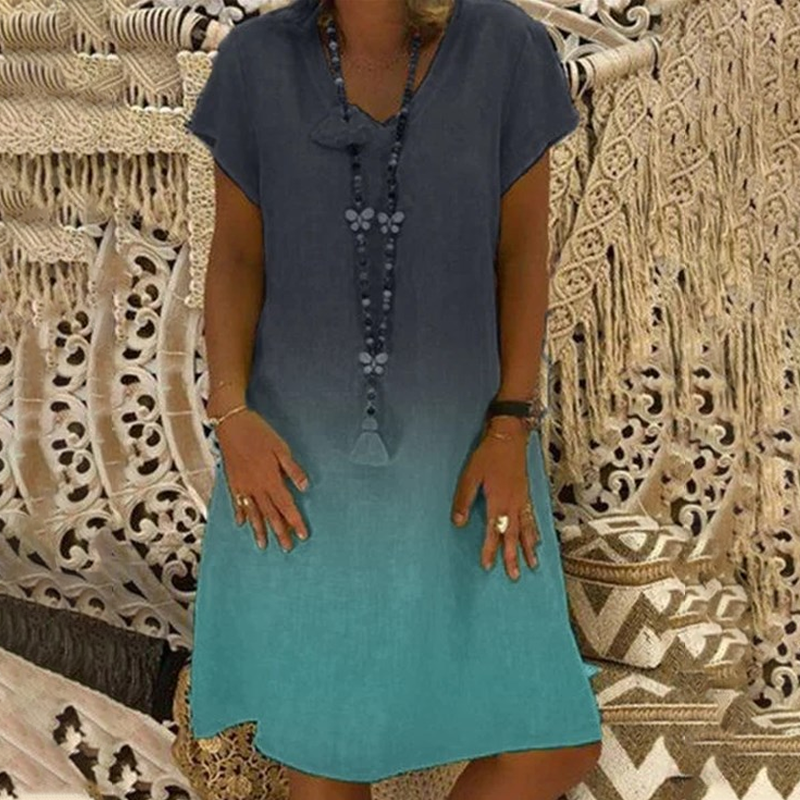 MĚKKÁ GRADIENTNÍ BARVA - bez námahy upoutá pozornost. Gradientní barevné provedení dodává jedinečnou vizuální přitažlivost a vytváří jemný přechod tónů, které krásně zachycují světlo. Díky tomuto designu působí šaty umělecky a zároveň moderně, což vám pomůže vyniknout, aniž by byly křiklavé. Ideální pro letní šatník, který hledá stylové osvěžení.